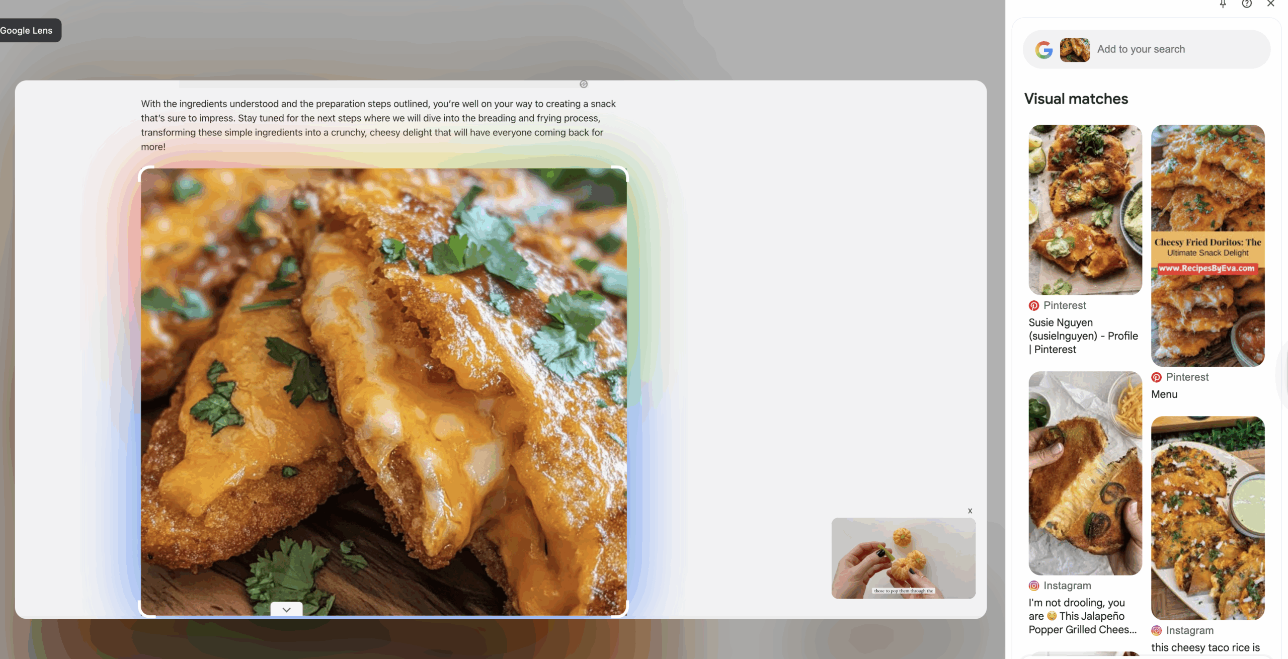 This AI slop recipe for “Crunchy Fried Cheese Stuffed Doritos” has no visual matches on Google Lens except for an AI-generated pin on Pinterest. When visual matches do come up, they often take you to the Facebook groups and pages of the AI slop farmer. (See the Facebook section below.)