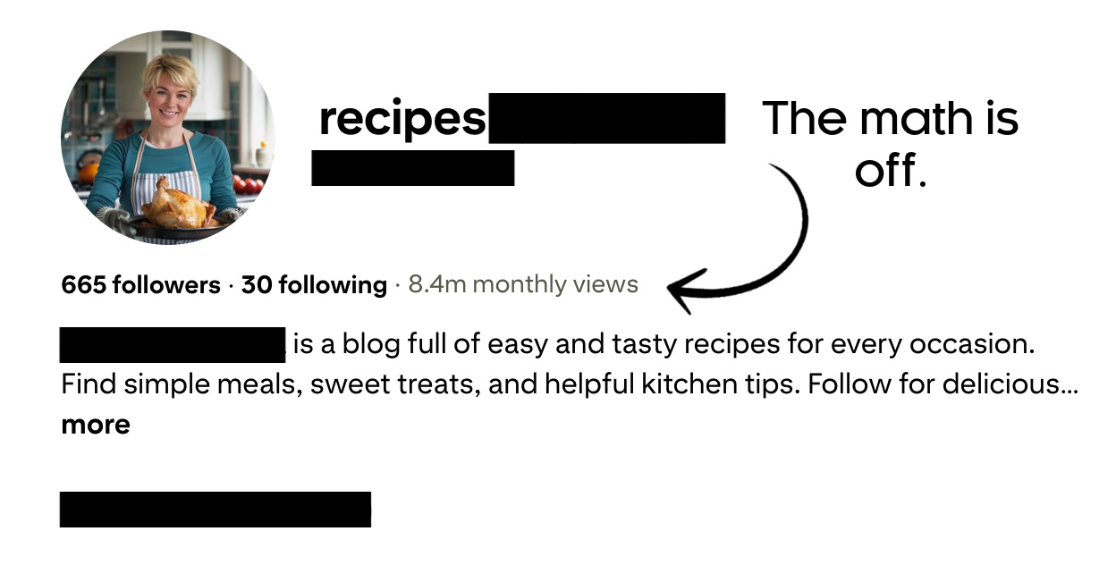 - Look at their Pinterest profile. Because they’re spamming Pinterest with pins, they have a high number of impressions, the number after the follower and following count, which are low in comparison to the number of impressions. A real food blogger would love these kinds of numbers. Real food bloggers don’t spam Pinterest with pins because they don’t want their accounts shut down; they’ve invested way too much time and resources developing their following and curating content. The fraudsters will just start a new account.