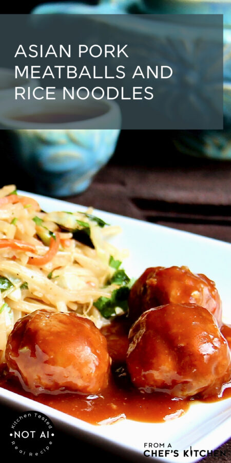 Asian Pork Meatballs and Rice Noodles with cabbage and carrots combine for a delicious, budget-friendly Asian-inspired meal. Tender meatballs deliver juicy, umami-packed flavor while the noodles complement perfectly with a lighter, vegetable-forward bite. Together, they make a balanced, satisfying meal perfect for busy weeknights or casual entertaining.