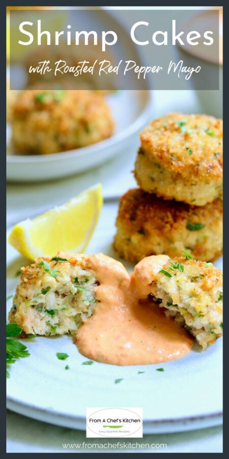 Hey, shrimp lovers! (Okay, that would be me, too!) I’ve got a recipe you’re going to love! Shrimp Cakes with Roasted Red Bell Pepper Mayonnaise are easy to make, reheat well and freeze well, too!