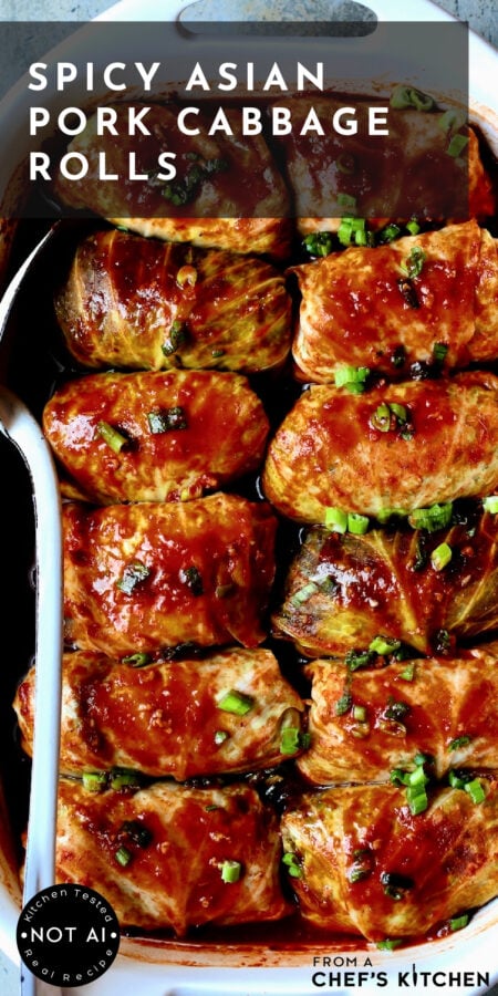 Spicy Asian Pork Cabbage Rolls are a bold, flavor-packed twist on classic cabbage rolls! Tender cabbage leaves are filled with ground pork, ginger, garlic, and savory Asian seasonings, then baked in a sweet-spicy sauce for a restaurant-quality meal that’s surprisingly easy for weeknights. Serve with my Miso-Glazed Eggplant and Asian Cucumber Salad for a truly memorable meal!